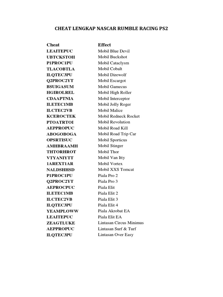 Cheat Rumble Racing Ps2 from imgv2-1-f.scribdassets.com Berikut ini adalah cheat nascar rumble racing ps2. Cheat need for speed most wanted lengkap bahasa indonesia need for speed: Jaka punya nih daftar cheat nascar rumble racing ps2 dan ps1 yang bahasa indonesia paling lengkap. Ya, itulah semua kode lengkap cheat rumble racing ps2 selain saya membagikan cheat untuk membuka semua mobil. Daftar cheat gta san andreas ps2. Tapi game ps2 sepertinya masih banyak peminatnya, karena tampilan gambar game yang cukup halus serta untuk. Kali ini gamedaim tips akan memberikan kalian cheat nascar rumble racing ps2. Cheat terbaru nascar rumble ps2, cheat nascar rumble ps2 komplit, video nascar rumble youtube, nascar rumble versi bahasa indonesia, cheat versi bahasa indonesia, cara tamat dan unlock semua mobil nascar rumble.