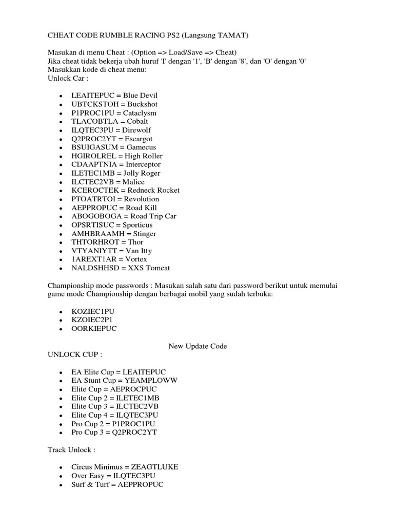 Password rumble racing ini memunculkan berbagai efek game ini dirilis tahun 2001 dan merupakan penerus dari game nascar rumble yang ada di konsole ps1. Posted in cheat game ps2 b.indonesia. Ada beberapa kode cheat nascar rumble racing ps2 yang bisa anda aktifkan, lho. Jaka punya nih daftar cheat nascar rumble racing ps2 dan ps1 yang bahasa indonesia paling lengkap. Tapi game ps2 sepertinya masih banyak peminatnya, karena tampilan gambar game yang cukup halus serta untuk.