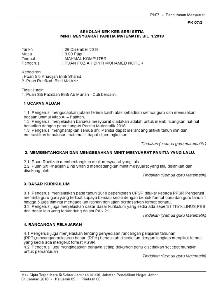 7.0 ciri mm yang berkualiti. Rujuk versi word format minit mesyuarat di bawah: Report minit mesyuarat rmt 2018. Minit mesyuarat hari keluarga omac 2020. Format mesyuarat yang akan dikongsikan adalah mengikut standard yang sering digunapakai. Dan yang paling penting ia mesti mengikut format terbaru. Format penulisan minit mesyuarat pengenalan 1. Minit mesyuarat adalah laporan mengenai perkara yang dibincangkan atau diputuskan dalam sesuatu mesyuarat. Mesyuarat.آ minit mesyuarat panitia sains rumah tangga daerah kinta utara tarikh :29.03.2018 hari. Biasanya kita akan taip dan tekan space bar (ruang jarak) sahaja untuk membezakan teks bukan? Minit mesyuarat pengurusan pentadbiran 2020 bil 1 2020 pages 1 12 text version anyflip. Mesyuarat merupakan satu prosedur pentadbiran yang wajib dilakukan oleh setiap pengurusan sekolah. Untuk memastikan perjalan pengurusan sekolah berjalan dengan lancar, mesyuarat perlu dilakukan.