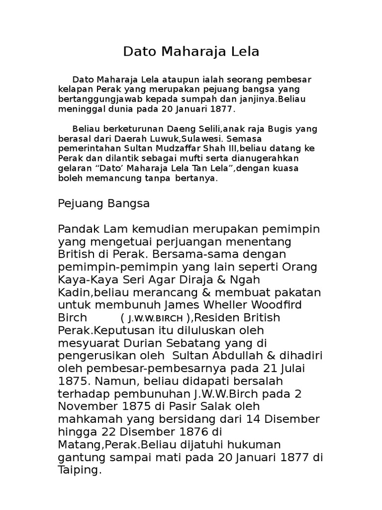 Dato' maharaja lela ialah pembesar kelapan perak yang merupakan pejuang bangsa yang bertanggungjawab kepada sumpah dan janjinya. Beliau tidak mahu mengotorkan dirinya menjadi pencacai british, sebaliknya dengan penuh strategi dan umpamanya mempertahankan sistem tradisional di perak yang. Dato' maharaja lela pandak lam (meninggal dunia: Dato seri maharaja lela abdullah. For faster navigation, this iframe is preloading the wikiwand page for dato maharaja lela.