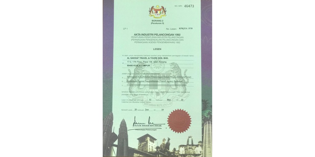 Pelancong di bawah seksyen 31c akta industri pelancongan 1992 di bawah subseksyen 12(2)(b) akta cukai pelancongan 2017. Mempunyai kontrak lesen perniagaan pelancongan dalam negeri yang diluluskan oleh pesuruhjaya pelancongan di bawah akta industri pelancongan 1992. Kontrak yang berhubungan dengan ziarah keagamaan. Deposit maksimum sebanyak 25% daripada tambang pelancongan setiap orang mesti dibayar sebagai fi penempahan. Merancang pelaksanaan kempen kesedaran kepada orang awam. Ia merupakan satu kesalahan yang boleh diambil tindakan di bawah akta industri pelancongan 1992 (akta 482), menurut pengarah kanan bahagian domestik dan acara, lembaga promosi. Kementerian pelancongan dan kebudayaan, digesa menyemak semula akta industri pelancongan 1992 sama ada melakukan pindaan atau menggubal akta baharu. Ini termasuk cadangan memperkenalkan lesen khas atau 'sub license' bagi syarikat pelancongan yang ingin menawarkan pakej umrah. Walau bagaimanapun, harus ditegaskan bahawa walaupun terdapat kesukaran untuk menjelaskan defi nisinya namun pelancongan budaya adalah suatu fenomena yang wujud. Di bawah akta industri pelancongan 1992 akta 482 dan kontrak bagi penggalakan pelancongan di malaysia 7. Adakah dibenarkan perubahan ahli lembaga pengarah / pemegang saham yang melibatkan di antara bumiputera dan bukan bumiputera? Authoritative text the commissioner of law revision malaysia. Access to biological resources and benefit sharing act 2017 (act 795) rm8.50.