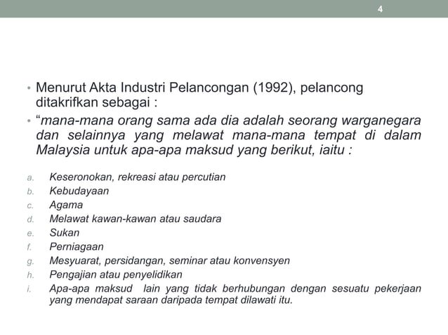 Undang Undang Malaysia Agc Gov My Atau Mana Mana Tempat Di Dalam Malaysia Pelancongan Ke Luar Negeri Ertinya Pelancongan Ke Atau Di Mana Mana Tempat Di Luar Malaysia from img.pdfslide.tips Bahagian pertama di dalam akta industri pelancongan 1992 memberitahu bahawa pengertian dan tafsiran pelancongan dan pelancongan. Pengendali agensi pelancongan diingat supaya tidak menyalah guna kebenaran gelembung perjalanan yang diberi kerajaan dengan memberi perkhidmatan kepada mereka yang ingin pulang berhari raya di kampung. Kementerian pelancongan dan kebudayaan akan mengkaji semula akta industri pelancongan 1992 bagi mengekang kes penipuan melibatkan ejen pelancongan daripada terus berleluasa di negara ini. Deposit maksimum sebanyak 25% daripada tambang pelancongan setiap orang mesti dibayar sebagai fi penempahan. Practicing lawyers, legal advisors, academicians and law students reference. Akta lembaga penggalakan pelancongan malaysia 1992 (akta 481) (hingga 15hb januari 2013) choosing a selection results in a full page refresh. Kementerian pelancongan seni dan budaya malaysia siaran media pemanjangan tempoh kelonggaran syarat bagi syarikat pengendali pelancongan yang dilesenkan di bawah akta. (akta industri pelancongan 1992, muka surat 8 dan 9) oleh yang demikian, keterangan di atas secara jelasnya menghadirkan justifikasi kukuh mengapa istilah 'pelancong gunung' itu adalah tidak tepat dari sudut konsep penggunaannya.