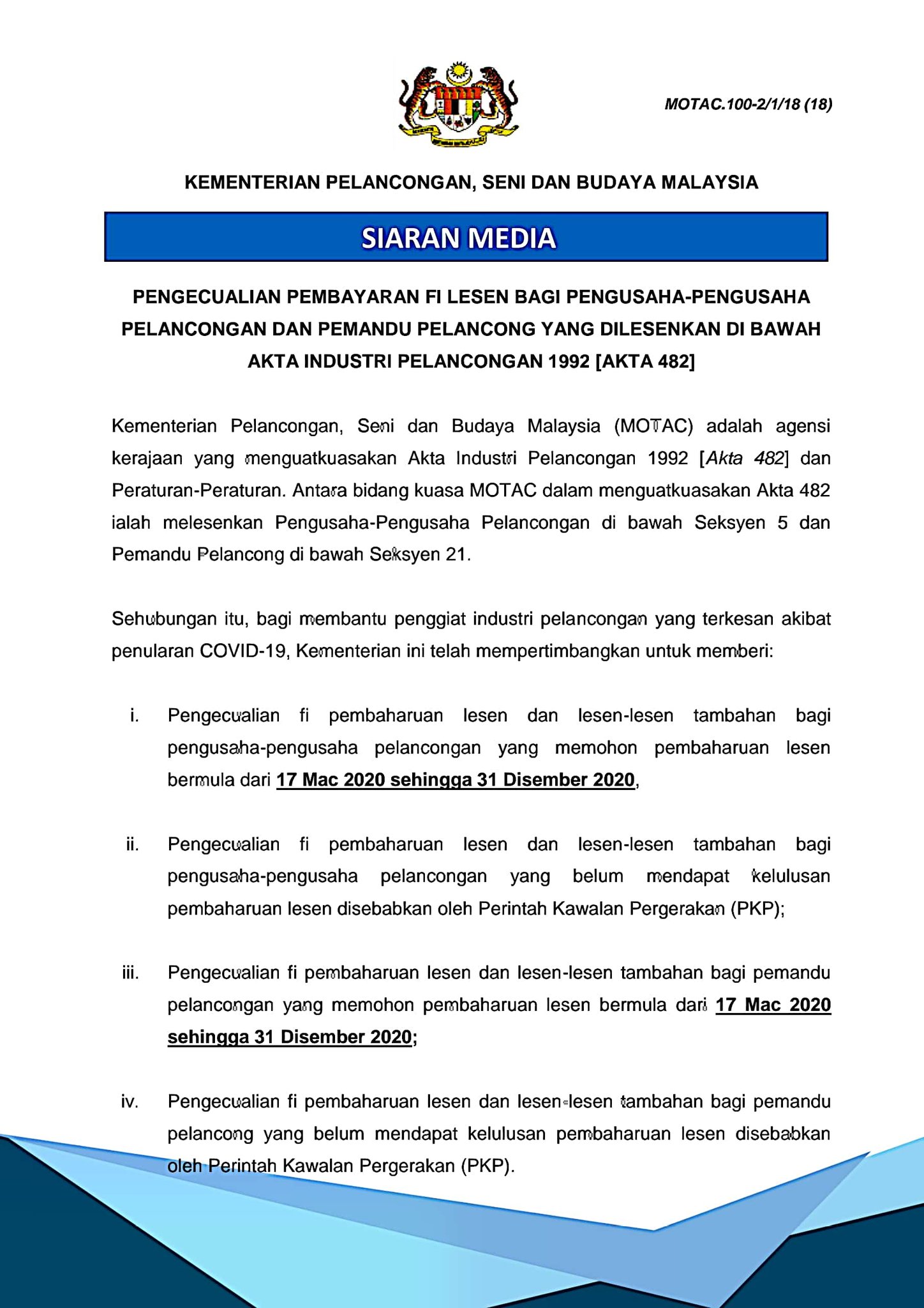 Akta Industri Pelancongan 1992 : Utxf8avdri9wvm / Kementerian pelancongan, seni dan budaya (motac) mengumumkan tiga kelonggaran kepada syarikat yang dilesenkan di bawah akta industri pelancongan 1992 (akta 482).