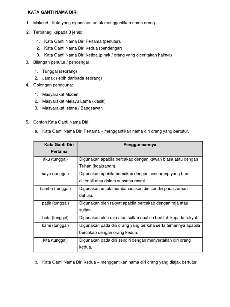 Kata Ganti Nama Diri Kedua : Kata Ganti Nama Diri Pertama / Jamak lebih daripada seorang 4.. Terdapat juga empat lagi jenis kata ganti yang lain iaitu kata ganti diri singkat, kata ganti tanya. Aku, saya, beta, patik, hamba, daku tunggal kata ganti nama diri pertama kami, kita jamak. Kata ganti nama diri other contents. Merujuk kepada diri sendiri apabila bercakap dengan orang rapat. Kata ganti nama diri ketiga (pihak / orang yang diceritakan halnya) 3.